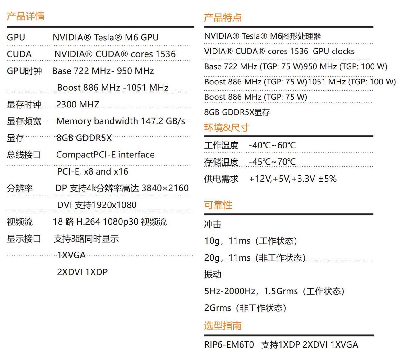 一款CPCI-E發燒級獨立顯卡,采用NVIDIA? Tesla? M6 圖形加速器 芯 片 設 計 , NVIDIA? Tesla? M6 GPU Memory clock 2300 MHz為 256Bit 8GB GDDR5顯 存 ; 具 有 出 色 多 顯 示 輸 出 接 口 、 NVIDIA? Tesla? M6 GPU 加速器針對刀片式服務器進行了優化,能 為數據中心的虛擬工作站、桌面和應用程序提供高性能圖形。該加速器 與 NVIDIA GRID? 軟件無縫地配合工作 ,可使企業虛擬化包括專業圖形 應用程序在內的眾多應用程序,并將這些應用程序傳輸到設備中,該產品有良好計算和圖形性能。